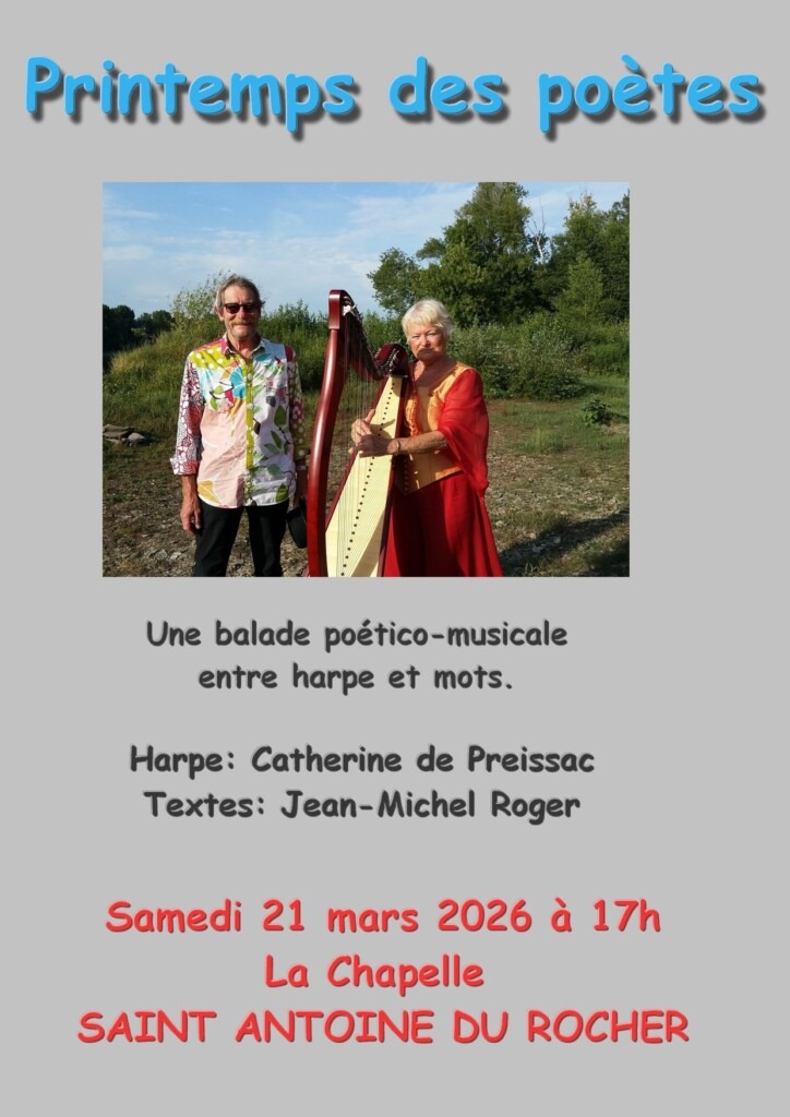 A cette occasion, Jean-Michel ROGER passeur des mots de Victor Hugo, Jean Anouilh, Jacques Prévert, Raymond Queneau, Jean de la Fontaine… et son amie harpiste vous propose une rencontre poétique et musicale à la Chapelle – Place de la Chapelle le samedi 21 mars 2026 à 17h